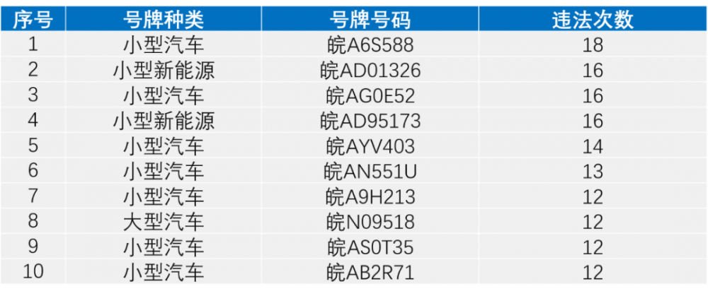 | 【导语】: 为有效预防和减少道路交通事故,营造平安畅通的道路交通环境,合肥市公安局交警支队向社会公布全市2023年1月份终生禁驾人员名单、非现场处罚违法车辆TOP10。 |