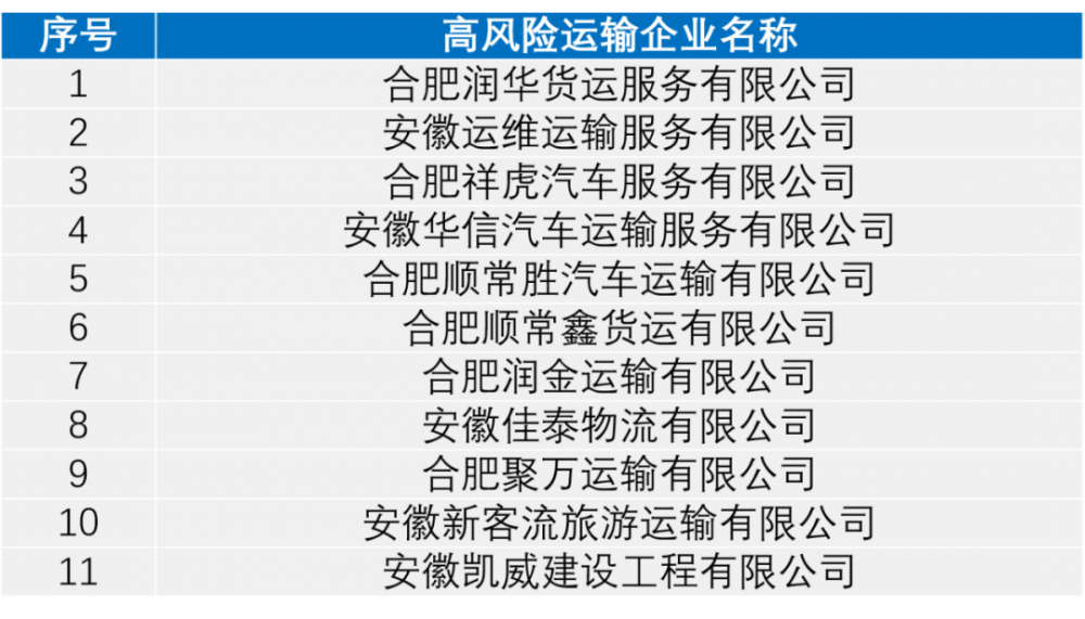 为深入推进道路交通事故预防“减量控大”工作,公安部交通管理局根据机动车和驾驶人相关指标,确定了一批交通安全高风险运输企业。现对2023年1月份涉及我市交通安全高风险的运输企业予以曝光,督促相关企业落实主体责任,尽快消除交通安全风险隐患,保障道路通行安全。 请上述交通安全高风险运输企业认真做好隐患整改工作,严格落实企业安全主体责任,加强对从业人员安全管理教育。夯实源头管理基础,确保道路交通运输安全。 更多信息请关注微信公众号【合肥帮】微信号:hefeibang! 关注我们,在合肥不迷路!