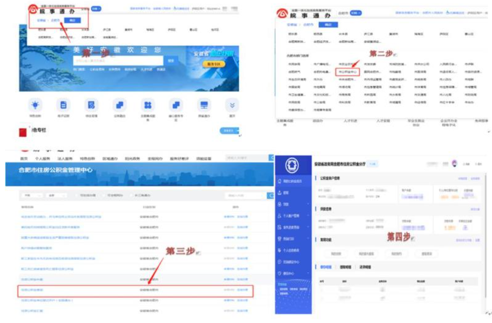 方法三:从电脑端网页搜索“安徽政务服务网”,经注册、中级认证成功后,定位选择“合肥”,点击“市公积金中心”,选择“住房公积金查询”,选择“在线办理”即可查询公积金信息,如图: