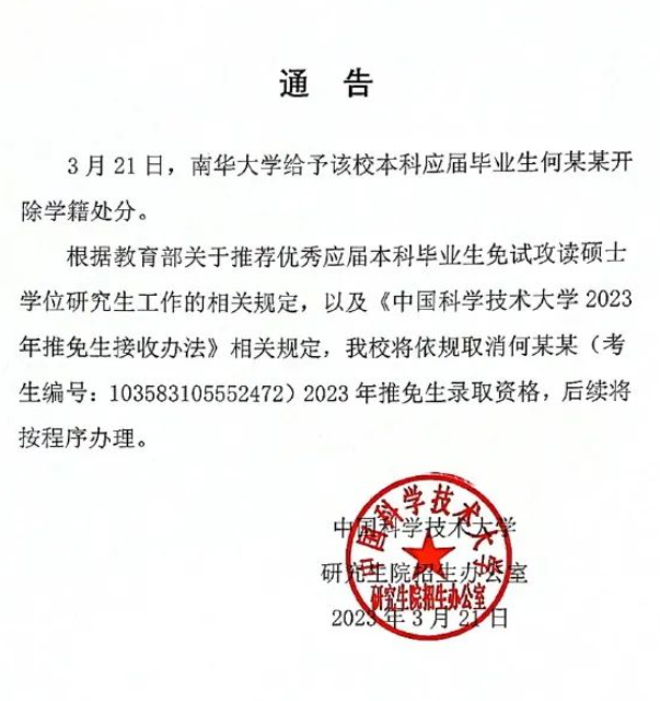 刚刚,中国科学技术大学官方微博发布“中国科学技术大学研究生院招生办公室关于取消何某某推免生录取资格的通告”,具体如下: