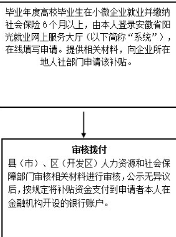 高校毕业生一次性就业补贴 申报时间: 每季度末25日以后至次月5日 发放标准: 由就业补助资金给予高校毕业生每人3000元的一次性就业补贴。 申报主体: 小微企业吸纳的毕业年度高校毕业生(毕业年度:指毕业所在自然年,即1月1日至12月31日)。 申请条件: 与企业签订6个月以上劳动合同且稳定就业6个月以上(含6个月)并参保的毕业年度高校毕业生(如:2019年毕业需符合在2019年被单位录用且在当年有参保记录)。 申报材料: 1.《高校毕业就业生一次性就业补贴申请表》; 2.提交毕业证书日期之后至少连续6个月的社会保险缴费凭证(自助打印或上网打印个人参保证明); 3.高校毕业生毕业证书复印件; 4.劳动合同复印件; 5.企业营业执照复印件一份 6.小微企业名录查询界面截图一份(盖单位公章)且查询界面企业登记机关为“市场监督管理局”。 (小微企业认定以国家市场监督管理总局“小微企业名录”为准,查询网址http://xwqy.gsxt.gov.cn/) 线下申请地点:各区县市行政服务大厅 申请流程图: