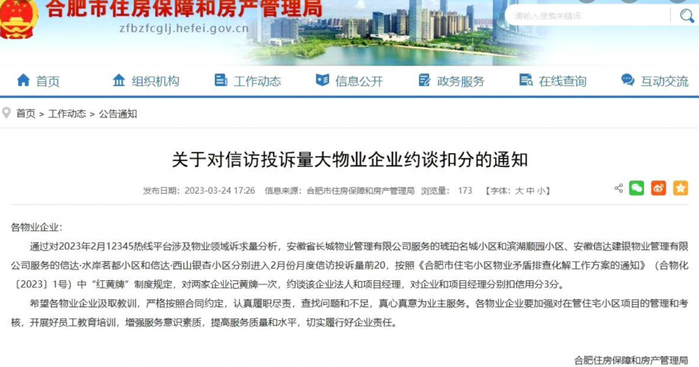 3月24日,合肥市房产局发布《关于对信访投诉量大物业企业约谈扣分的通知》,通过对2023年2月12345热线平台涉及物业领域诉求量分析,安徽省长城物业管理有限公司服务的琥珀名城小区和滨湖顺园小区、安徽信达建银物业管理有限公司服务的信达·水岸茗都小区和信达·西山银杏小区分别进入2月份月度信访投诉量前20。