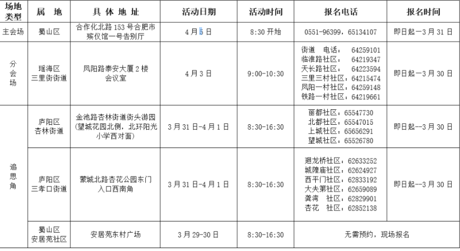 又是一年清明时,梨花风起寄哀思。在这慎终追远、缅怀故人、寄托哀思的时节,为进一步倡导文明祭祀新风,在合肥市民政局指导下,合肥市殡葬管理处将联动瑶海区、蜀山区、庐阳区共同开展 “人文共祭·爱传万家”清明祭祀系列活动。 今年的共祭活动以“清明·亲民”为主题,以“思念有声·笔墨抒情”为创新点,融入点烛祈福、集体吟唱、书写悬挂心愿卡片等环节,宣扬相亲相爱、向上向善思想,倡导厚养薄葬理念,传承传统祭祀文化。 活动主会场设在合肥市殡仪馆一号告别厅,同时在瑶海区三里街街道设立分会场,在蜀山区安居苑社区、庐阳区杏林街道、三孝口街道设立3个追思角,方便市民就近参与。此外,活动继续秉承公益属性,市民免费参与。
