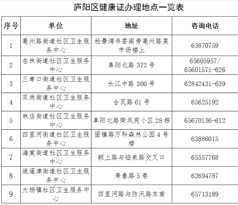 因区疾控中心业务工作变动,现停止办理健康证,辖区居民可通过“庐阳疾控”微信公众号预约选择就近的社区卫生服务中心办理,具体办证地点及联系方式如下: