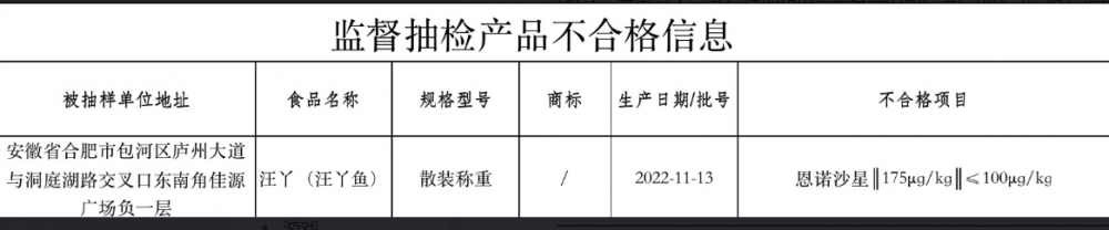 安徽百大合家福连锁超市股份有限公司佳源广场店(合肥)销售的汪丫(汪丫鱼),恩诺沙星不符合食品安全国家标准规定。检验机构为安徽省产品质量监督检验研究院。省市场监督管理局同步发布了相关科普信息:恩诺沙星属第三代喹诺酮类药物,是一类人工合成的广谱抗菌药,用于治疗动物的皮肤感染、呼吸道感染等,是动物专属用药。动物源性食品中恩诺沙星超标的原因,可能是在养殖过程中为快速控制疫病,养殖户违规加大用药量或不遵守休药期规定,致使产品上市销售时药物残留超标。 更多信息请关注微信公众号【合肥帮】微信号:hefeibang! 关注我们,在合肥不迷路!