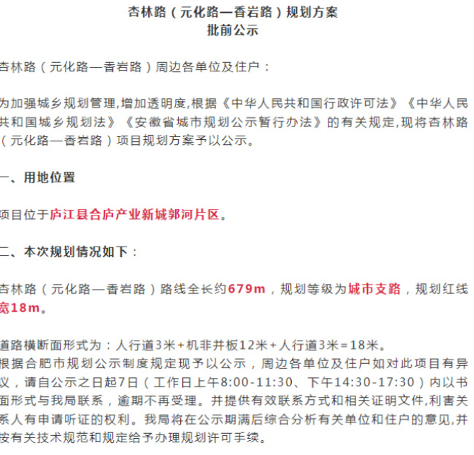 近日,庐江县自然资源和规划局针对合庐产业新城郭河片区拟新建两条道路,发布了批前公示,以下为2条路段公示详细信息: