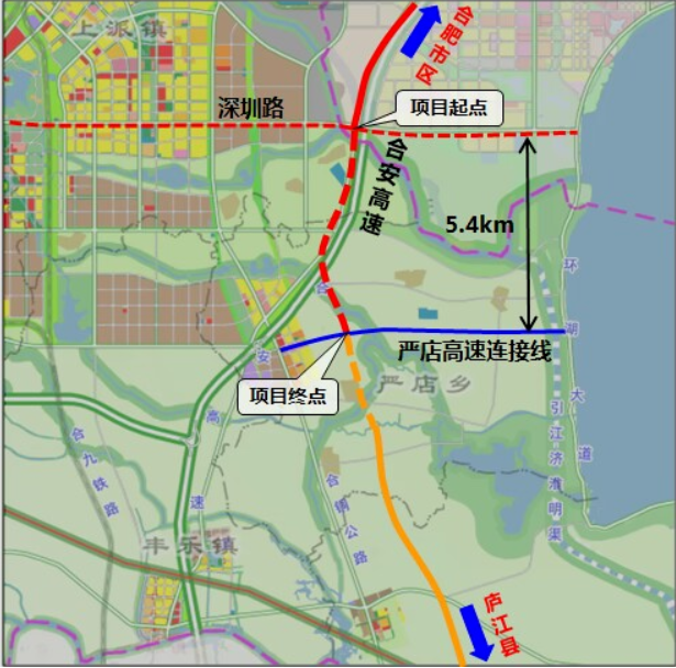 宿松路南延(深圳路-严店道口)示意图 宿松路南延的建设将打通合肥与庐江的新通道,加强合肥与庐江之间的联系,对于完善城市路网和推动周边产业发展具有重要作用。