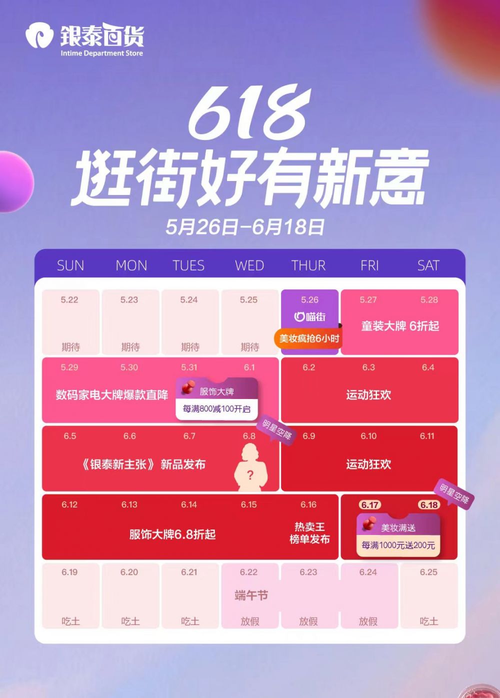银泰百货相关负责人透露,今年618银泰百货将突出一个“新”字,把重头放在新店新品和热卖品类好物上,并发布一系列银泰首发、IP联名商品,让消费者能够提前享受大牌新品。在颇受消费者关注的美妆品类方面,6月17日至18日期间,银泰百货将推出每满1000元送200元美妆服饰券的活动。此外,银泰百货全国各城市门店、I***TIME365会员店也将推出“炽热生活”新媒体艺术展、时装秀、mini音乐节、市集、游园会等一系列线下活动和明星到店活动。 |