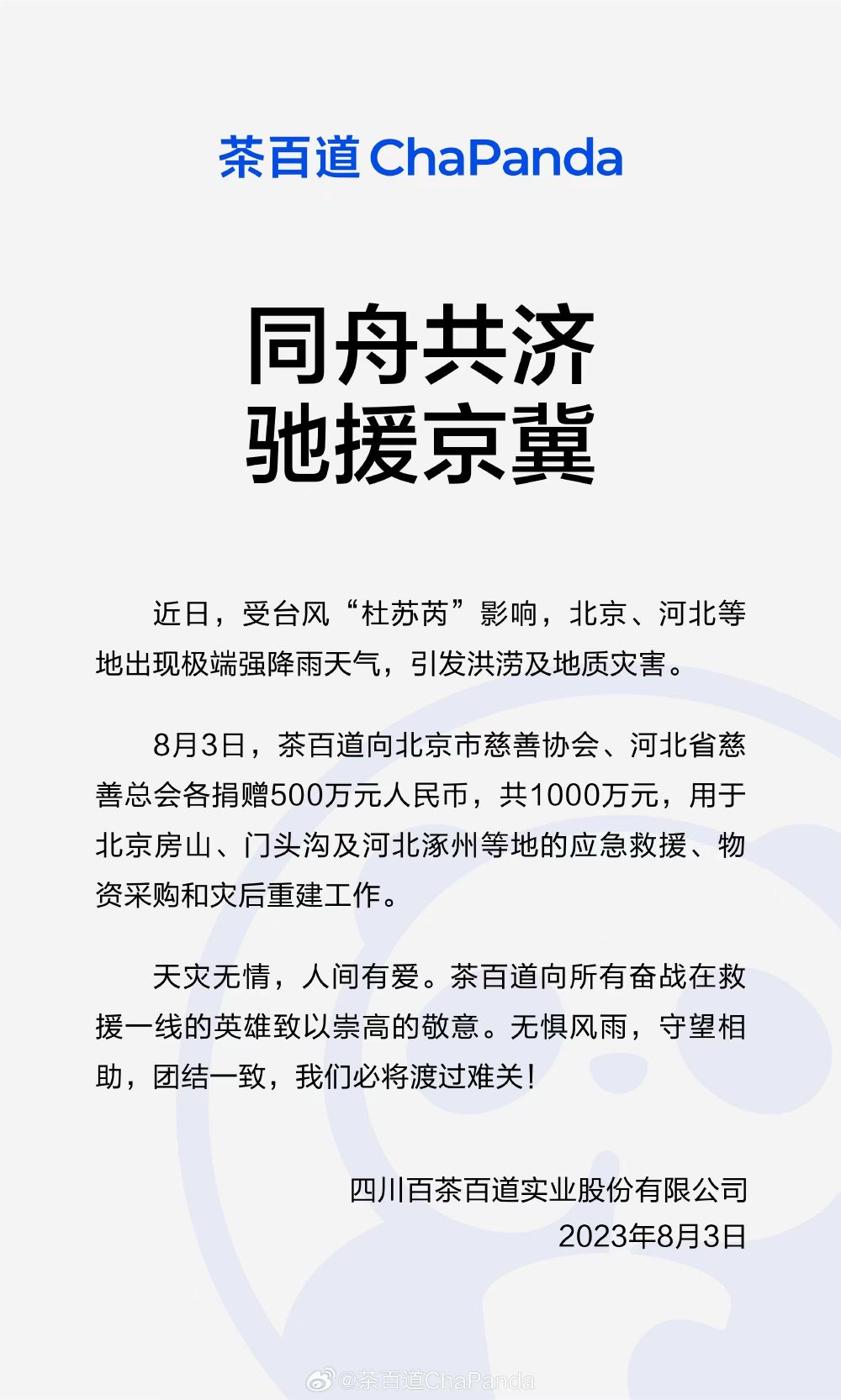 | 茶百道捐赠1000万元 支援北京河北抗汛救灾工作 |